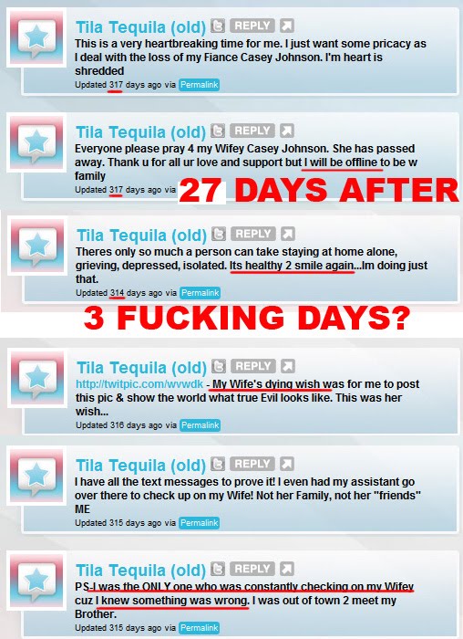 I hope that an investigation is launched into the whereabouts of Tila Tequila in the time frame in which Casey disappeared and was eventually found dead. I hope that Tila is brought to justice for withholding the truth and tampering with evidence in a death investigation. I hope Tila is held accountable for her actions, not only by law but by the media and by her "fans", who at this point seem as delusional and caught up in Tila's lies as she herself is.There's much more here, laid out in detail, I suggest checking it out.